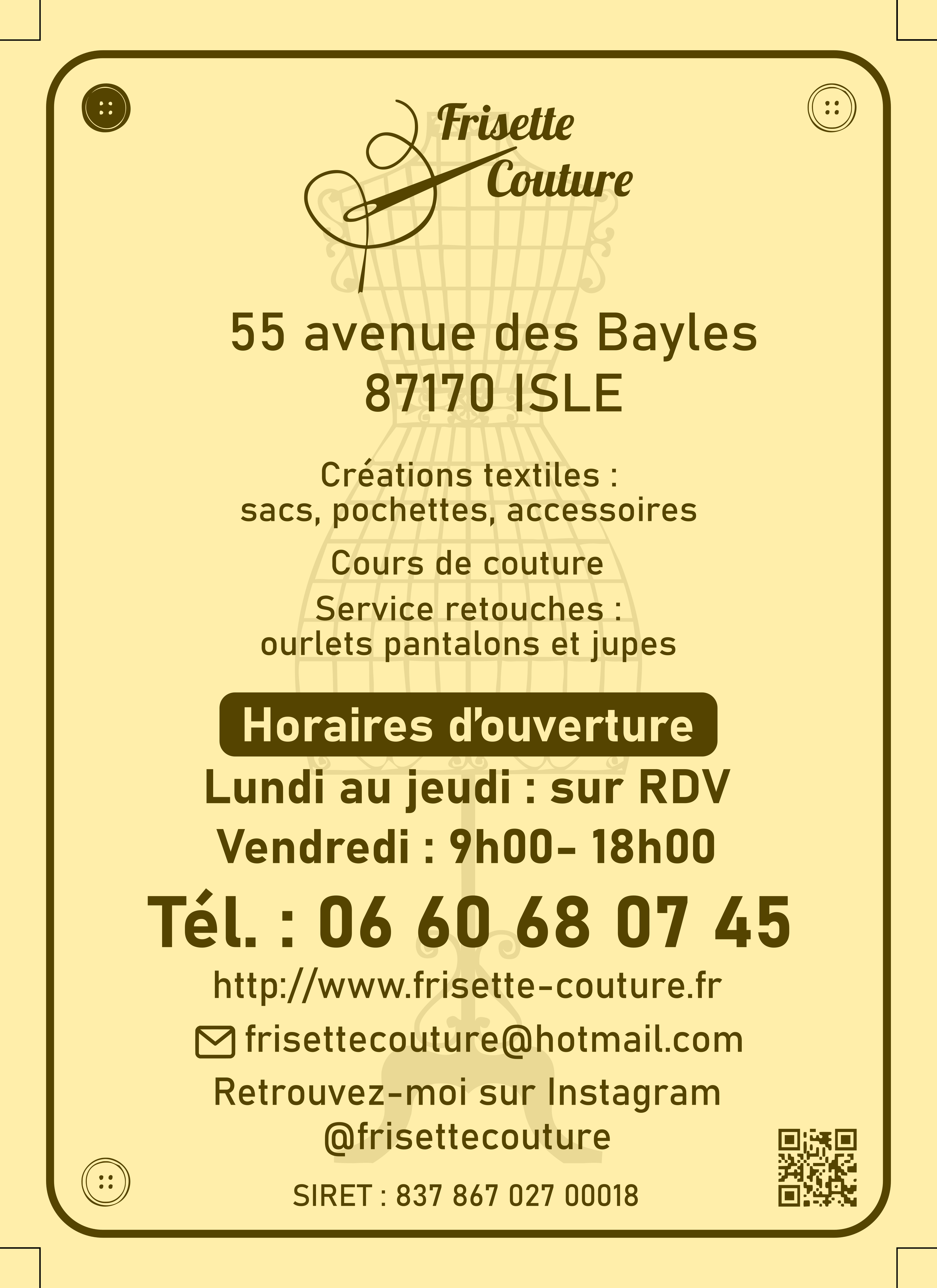 Contactez Frisette couture, votre atelier de couture sur Isle, en Haute-Vienne.